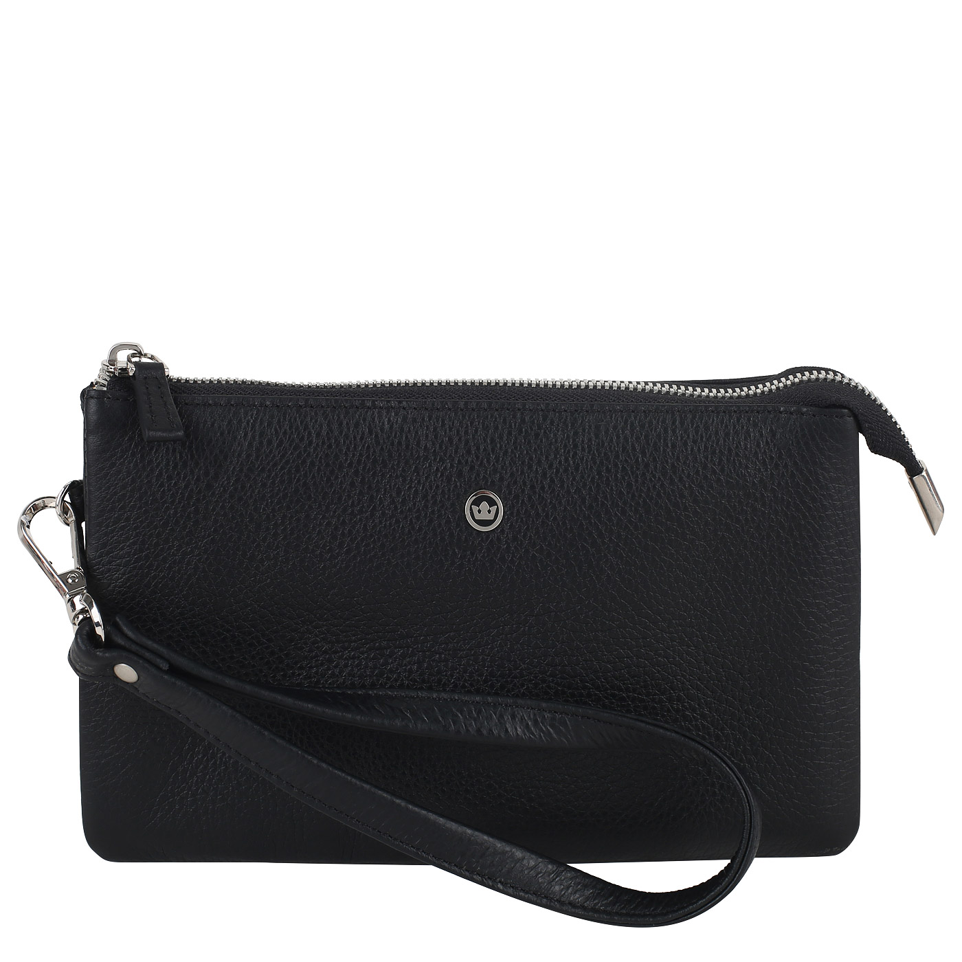 Удобный и элегантный клатч в классическом стиле. Изготовлен из натуральной черной кожи и закрывается на молнию. Аксессуар оборудован двумя отделениями и кармашком на молнии. Для пластиковых карточек и визиток внутри предусмотрено несколько открытых кармашков. На задней стенке клатча имеется внешний карман, который закрывается на молнию. В комплекте идет ремешок для запястья, который можно отстегивать.