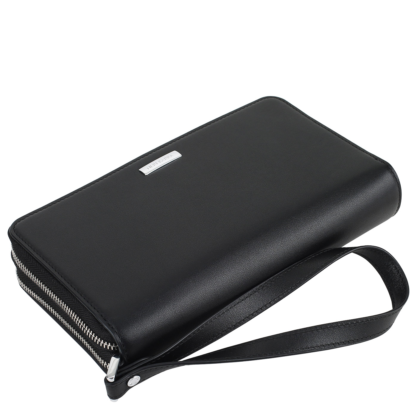 Размер, см. 22 х 13. Ремешок на запястье. Закрывается на молнию. Два автономных отделения на молнии. В первом отделении два отдела для купюр, разделенных между собой карманом на молнии для мелочи, кармашки для пластиковых карт, два открытых кармана. Во втором отделе шесть карманов для визиток или пластиковых карт, два кармана для документов, держатель для ручки.
