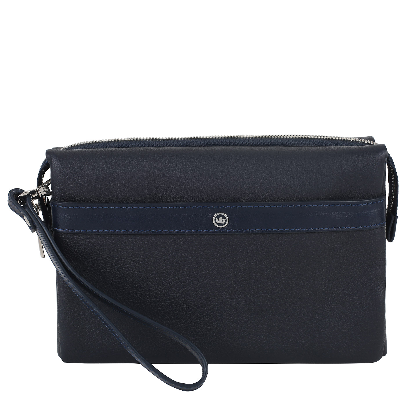Закрывается на молнию. Внутри два отделения, разделенные карманом на молнии. В первом отделении карман на молнии. Во втором отделении открытый карман. Съемный ремешок на запястье.